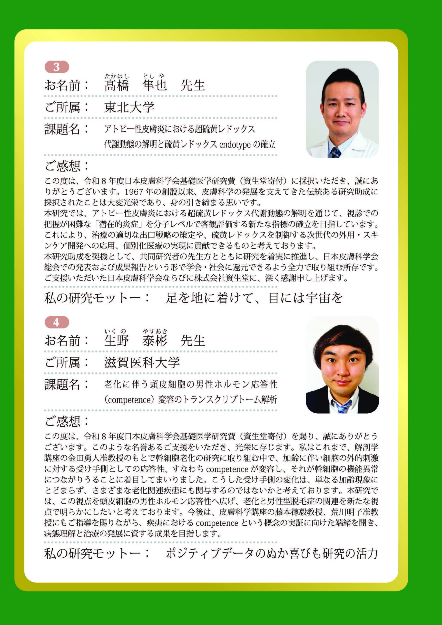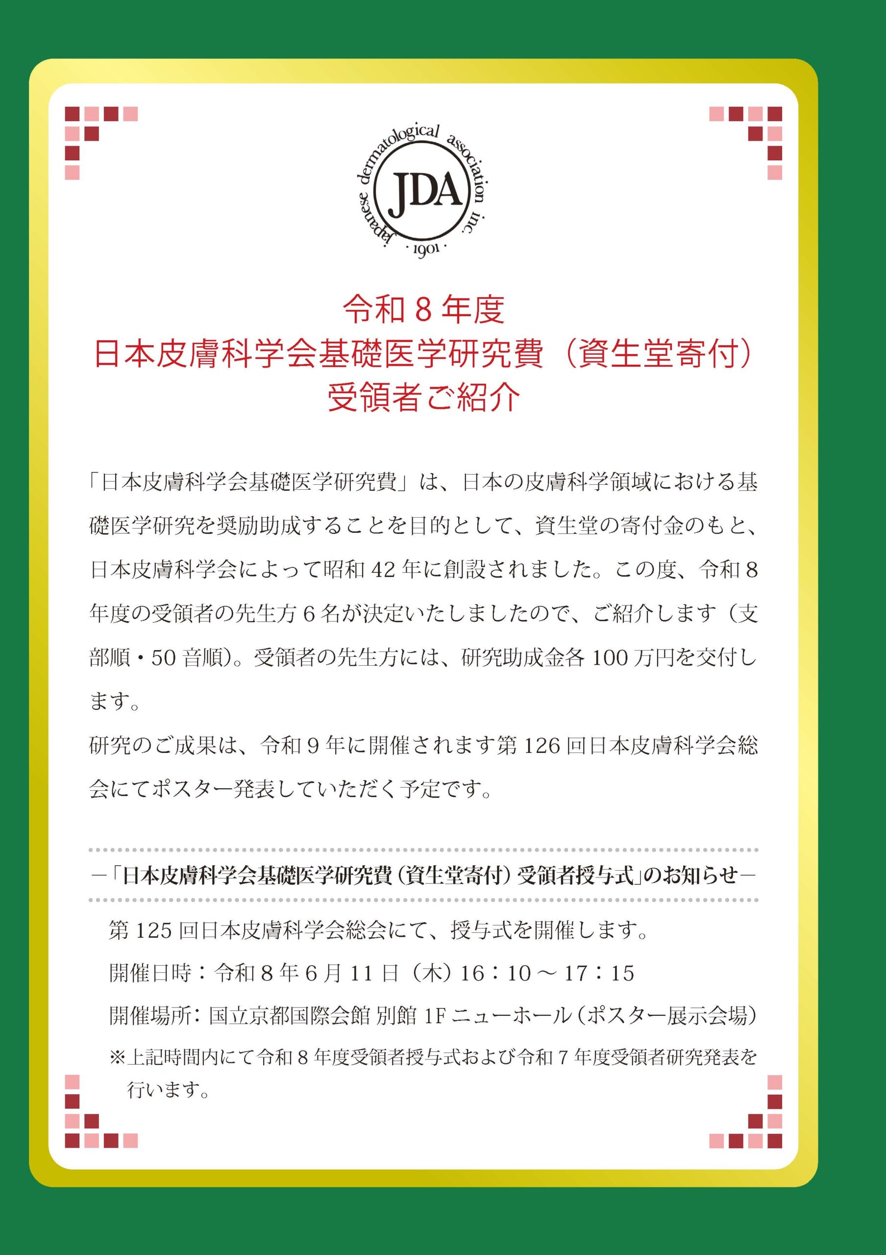 令和8年度日本皮膚科学会基礎医学研究費(資生堂寄付)の受領者について
