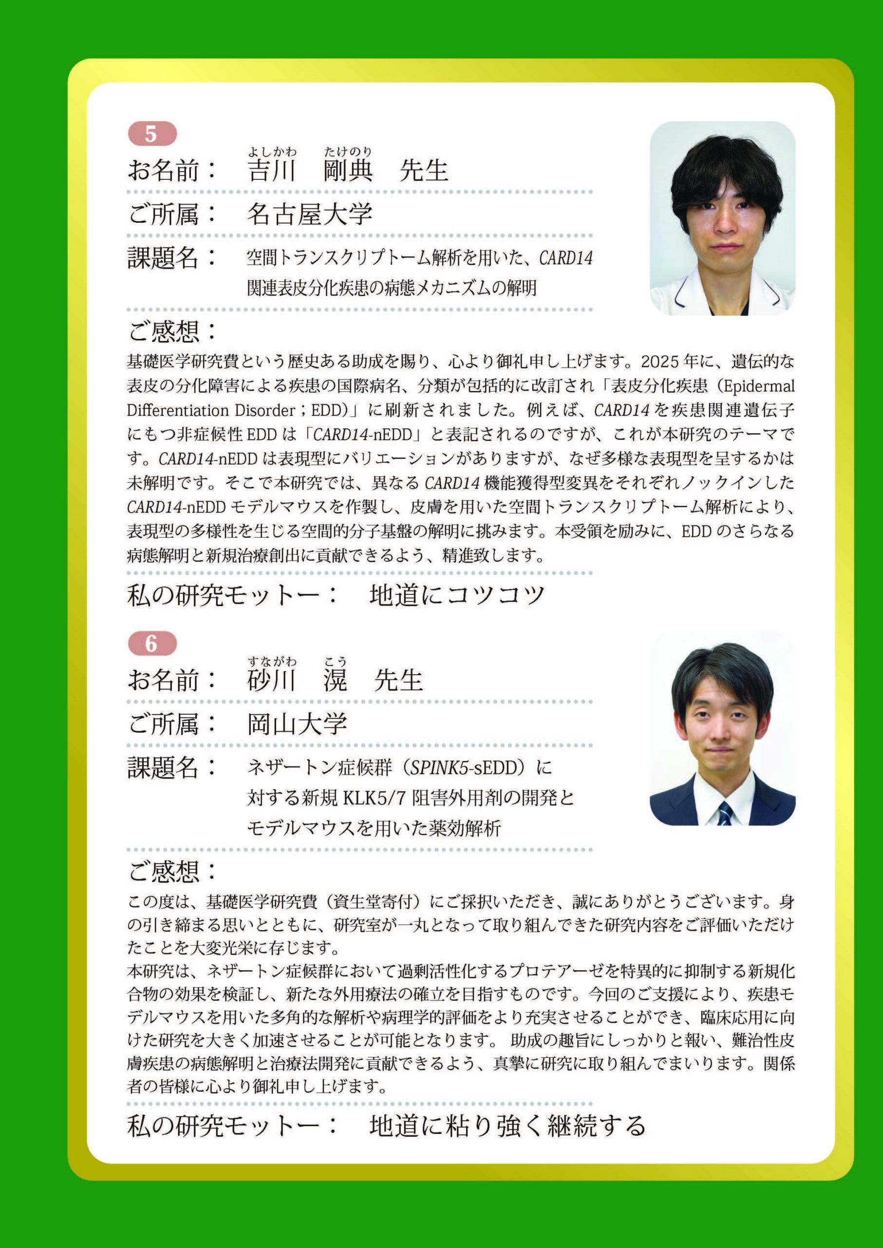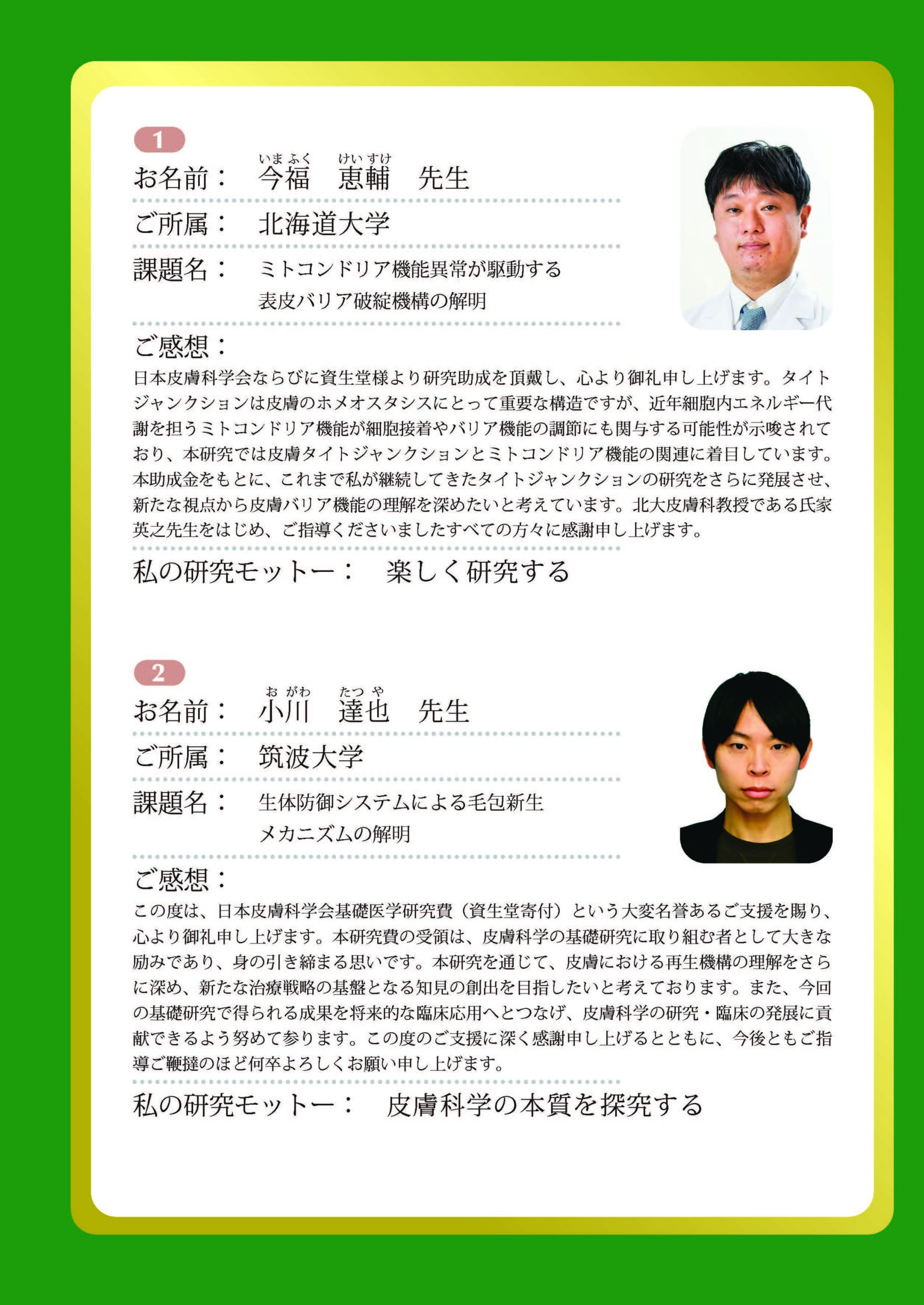 日本皮膚科学会基礎医学研究費(資生堂寄付)の受領者(6名)には,それぞれ研究助成金100万円が交付