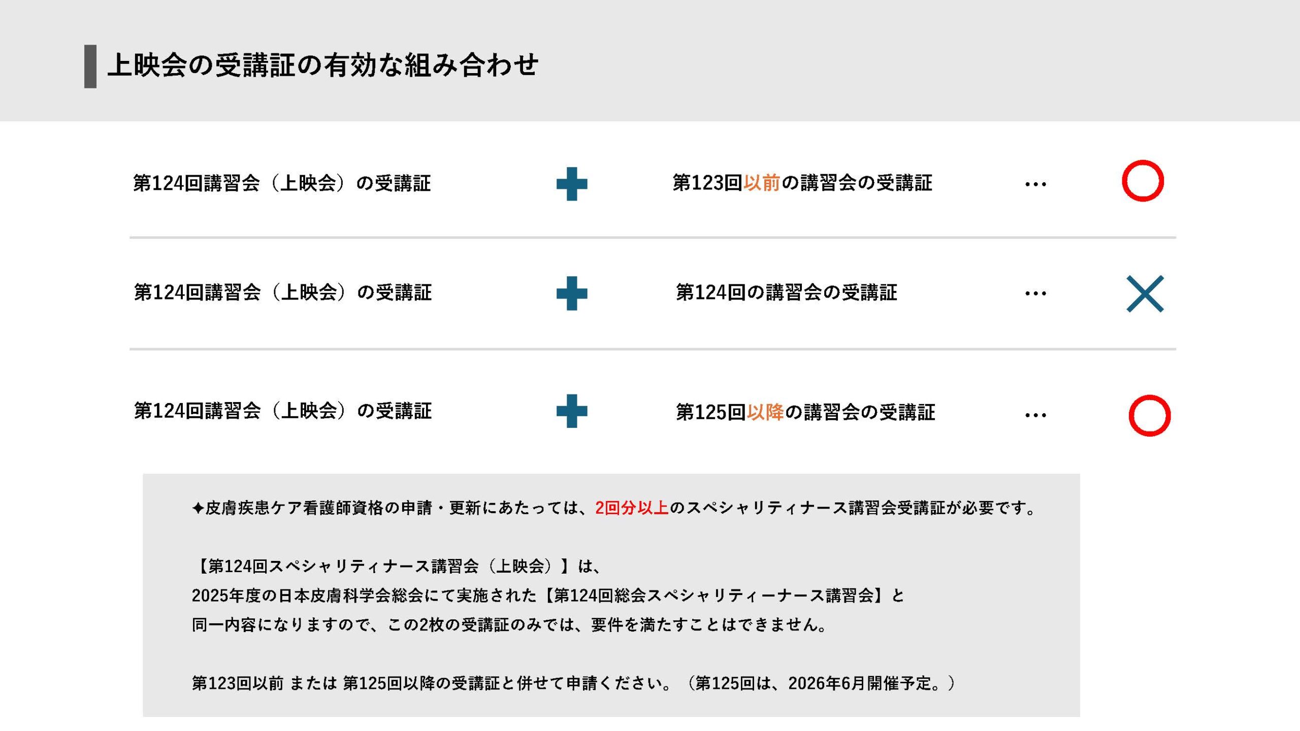 ・「第124回(2025年度)」の内容は、6/1(日)に現地で開催した第124回スペシャリティーナース講習会と同じものです。現地とE-Laerningどちらも受講しても、有効な修了証は1つまでです。